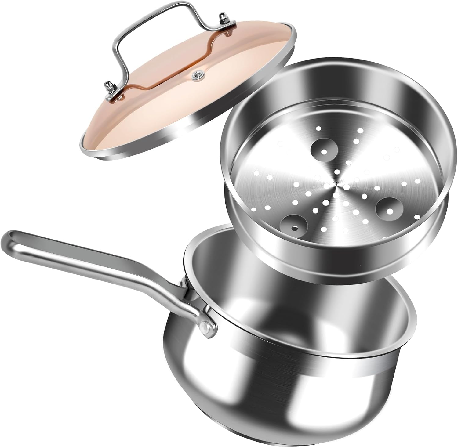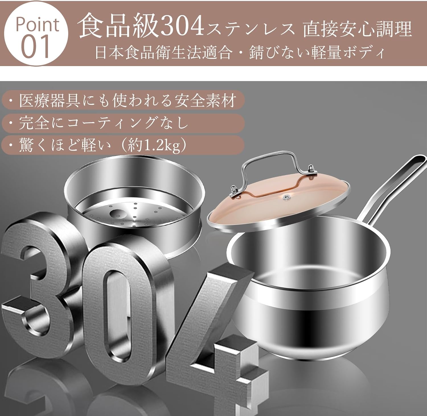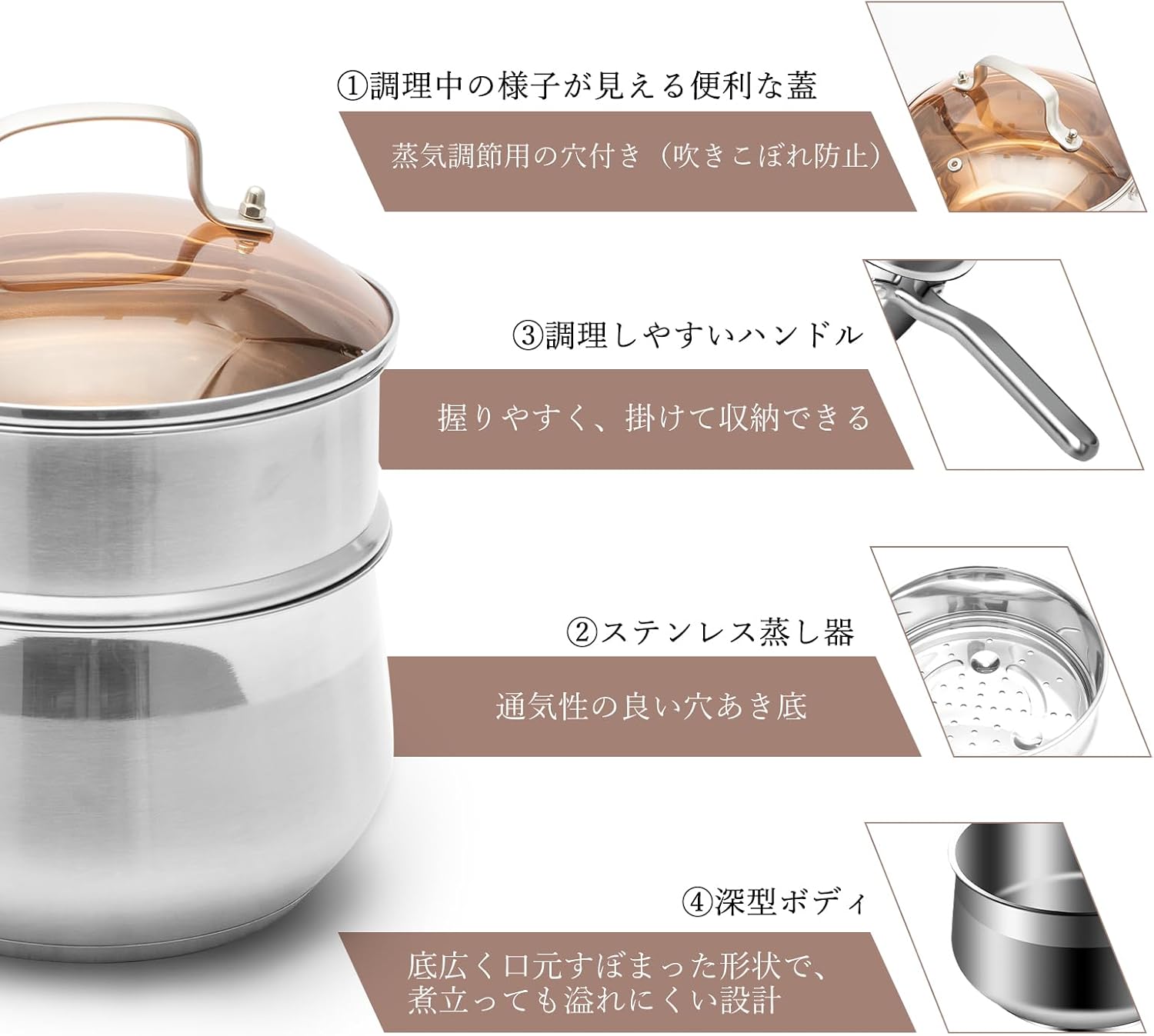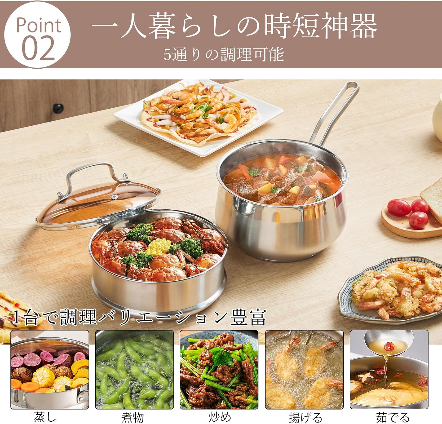 - 【蒸し器付き】このステンレス製の片手鍋は、1台で9役をこなす実力派です。少量の水で蒸す、少量の油で揚げる、炊く、茹でる、煮る、炒める、沸かすなど、多彩な調理が可能です。蒸し器と2段使いができるため、一度に2品を調理することができ、時短と省エネを実現します。普段使いから特別な日の調理まで、幅広いシーンで活躍するキッチンの万能な助手です。