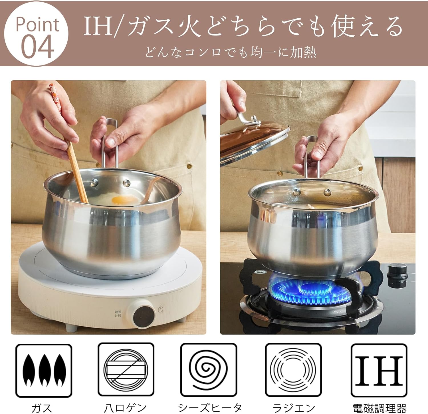 - 【ガラス蓋付き、IH/ガス対応】ガラス蓋付きで、蓋をしてゆっくり煮る必要のある食材に対応。食材を直接見ながら、調理過程をコントロールするのが容易。IH/ガスコンロに対応しており、さまざまな熱源に対応して、さまざまなニーズにお応える。