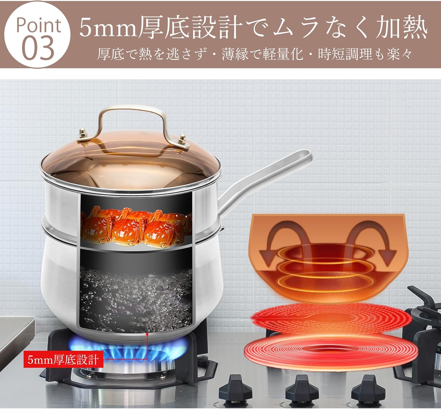 - 【ステンレス製】優れた熱伝導性を持ち合わせています。熱を素早く均一に伝え、調理時の火加減を細やかにコントロールしやすく、食材の旨みを最大限に引き出します。そのおかげで、お料理がより美味しく仕上がるだけでなく、調理時間の短縮にも寄与し、効率的なキッチンワークを実現します。
